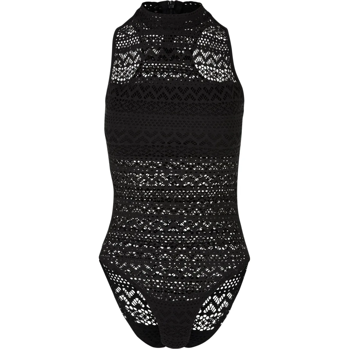 Met zijn transparante kant, een stijlvolle opstaande kraag en een sportieve haltertop is deze body een must-have stuk. Stretch jersey inzetstukken op de borst en in het kruis zorgen voor een zeer comfortabele pasvorm en gaan gepaard met een praktische halsrits. De romper heeft een drukknoopsluiting in het kruis. Het is gemaakt van elastisch kant en heeft een aansluitende pasvorm. Buitenstof 1: 98% Polyester 2% Elastaan, 165 gsm Voering 1: 95% katoen 5% elastaan, 180 gsm.