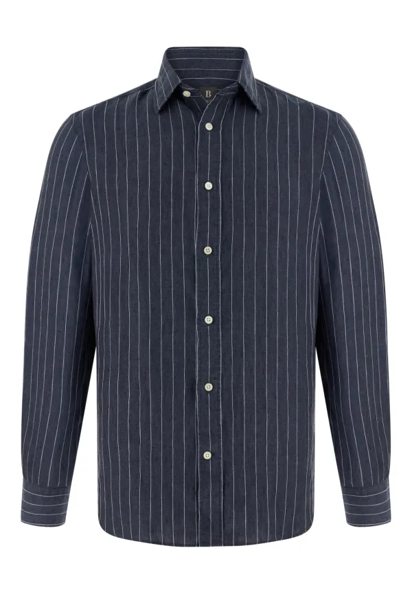 Design: Gevoerde zoom/rand; Type sluiting: Knoopsluiting; Materiaal: Linnen; Motief: Krijtstrepen; Kraag: Kentkraag; Extra's: All-over patroon; Pasvorm: Regular fit; Armlengte: Lange mouw