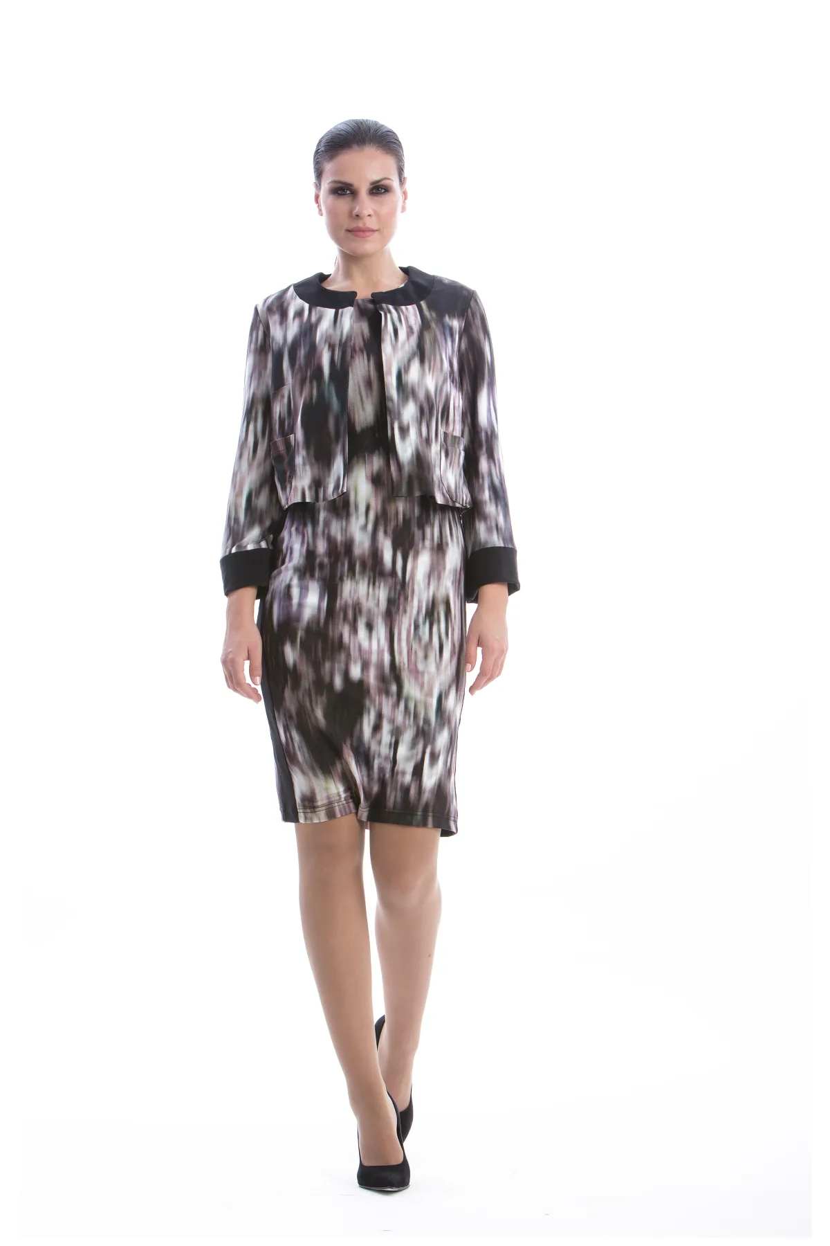 Bolero CONQUISTA in bedrukte stof: viscose-elastaan met 2 zakken aan de voorkant, effen kleur manchetten en afwerking bij de halslijn in zwart alcantara. Stretch polyester zwarte voering. Lange mouwen en een open voorkant. Lengte tot aan de taille. Het model is 1.77 m lang en draagt maat 36/S. 92% viscose-8% elastaan + 92% polyester-8% elastaan + 100% polyester.