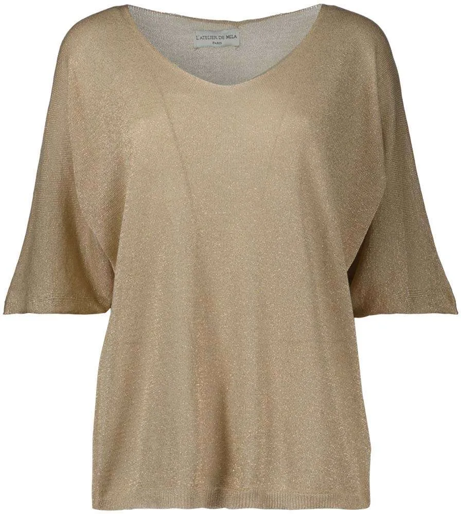 Wijdvallende top van Bomont met halve vlindermouwtjes. De top heeft een V-hals en een geribde zoom. Het metallic glitterdraadje geeft een leuk detail aan de top.