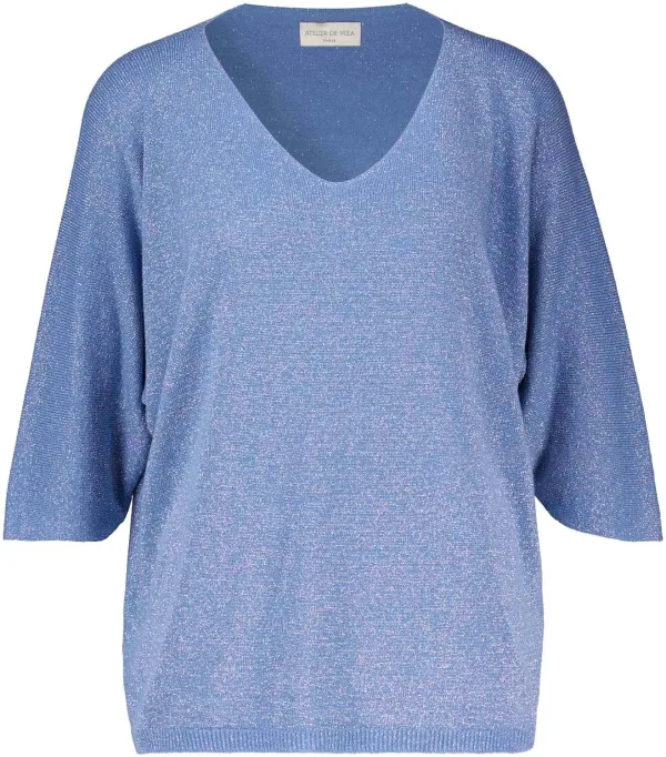 Wijdvallende top van Bomont met halve vlindermouwtjes. De top heeft een V-hals en een geribde zoom. Het metallic glitterdraadje geeft een leuk detail aan de top.