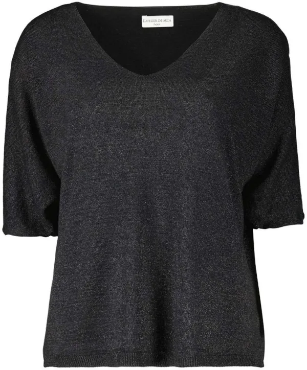 Wijdvallende top van Bomont met halve vlindermouwtjes. De top heeft een V-hals en een geribde zoom. Het metallic glitterdraadje geeft een leuk detail aan de top.