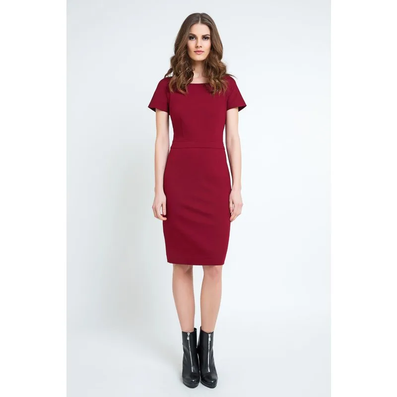Bordeaux jurk van Punto di Roma stof. Raglan kapmouwen en een ronde halslijn. Coupenaden bij de buste voor een perfecte pasvorm. Sluiting aan de achterkant met een dikke zwarte plastic rits van 50 cm. Tailleband in dezelfde stof. Kleine 10 cm split achteraan. Volledig gevoerd. Getailleerde silouette. Jurklengte voor maat 38: 100 cm. Ons model is 178 cm en draagt maat 36.
