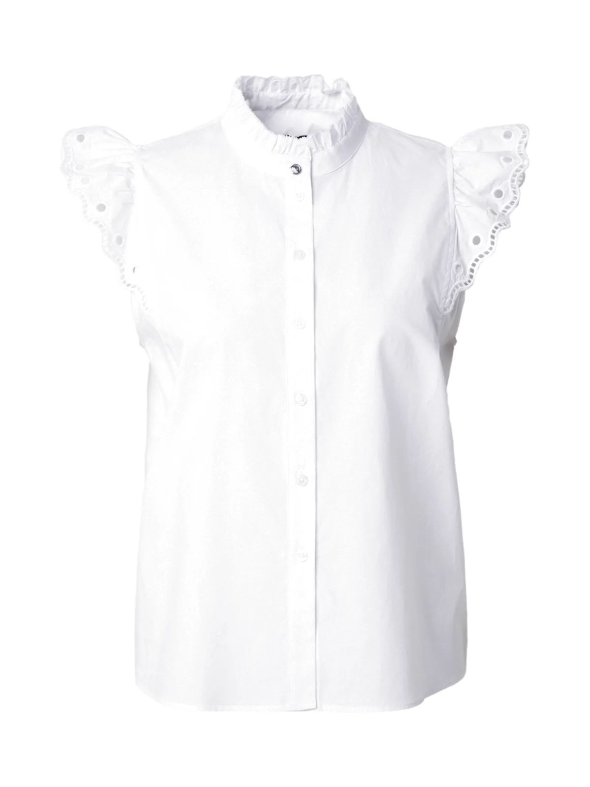 dames blouse van BOSS Orange;Model 'Balvana';look: effen kleuren;Pasvorm: regular fit;kraagmodel: opstaande kraag;Details: gaatjeskant volants;hals: hooggesloten;Sluiting: knoopsluiting;mouwvorm: zonder mouwen;Materiaal: puur katoen
