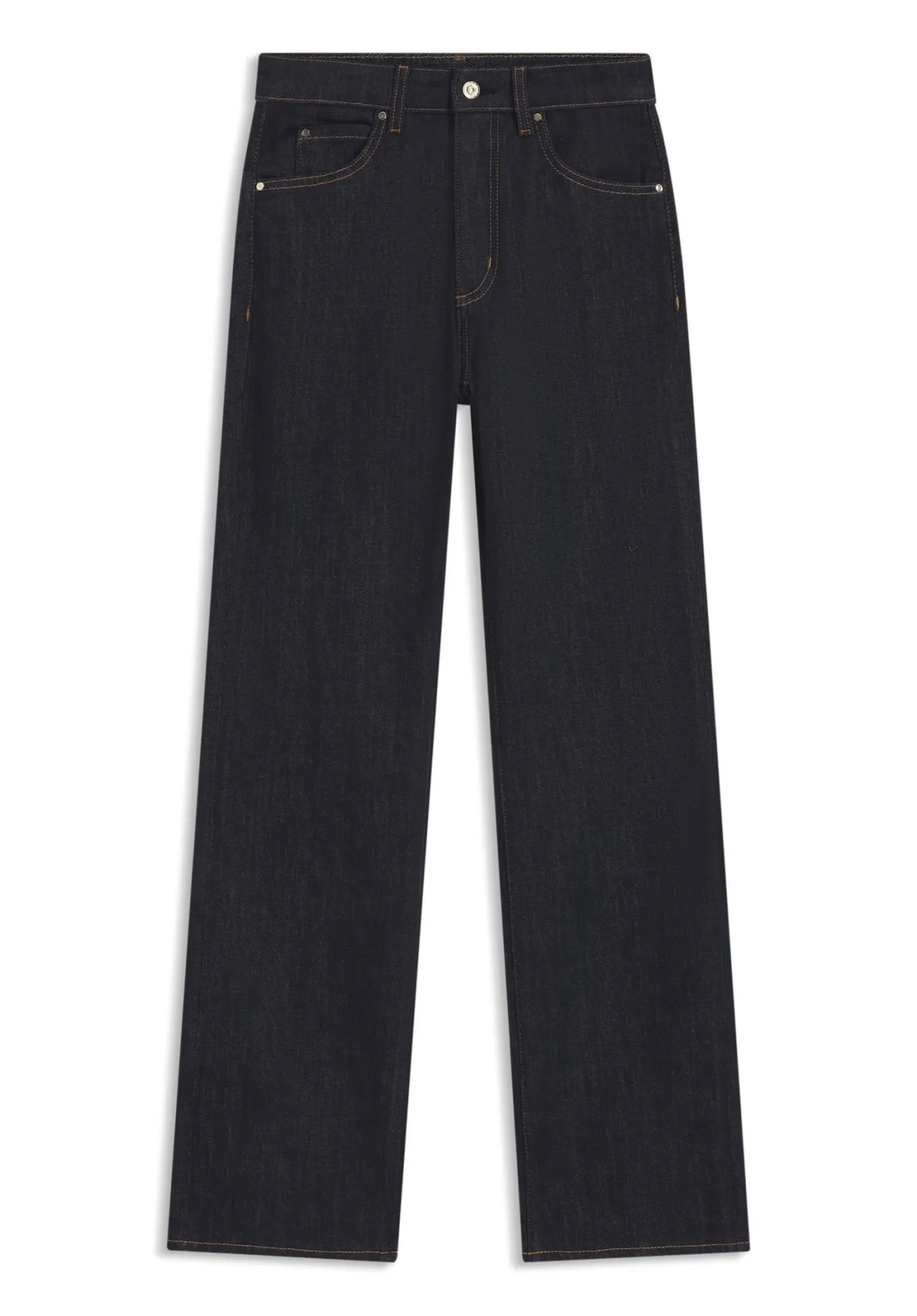 Design: 5-pocket-style, Knop sluiting; Type sluiting: Ritssluiting; Materiaal: Denim; Motief: Effen; Extra's: Studs, Contrasterende naden, Label patch/label flag; Wassing: Raw/unwashed; Lengte: Lang/maxi; Pasvorm: Regular; Taillehoogte: Mid waist