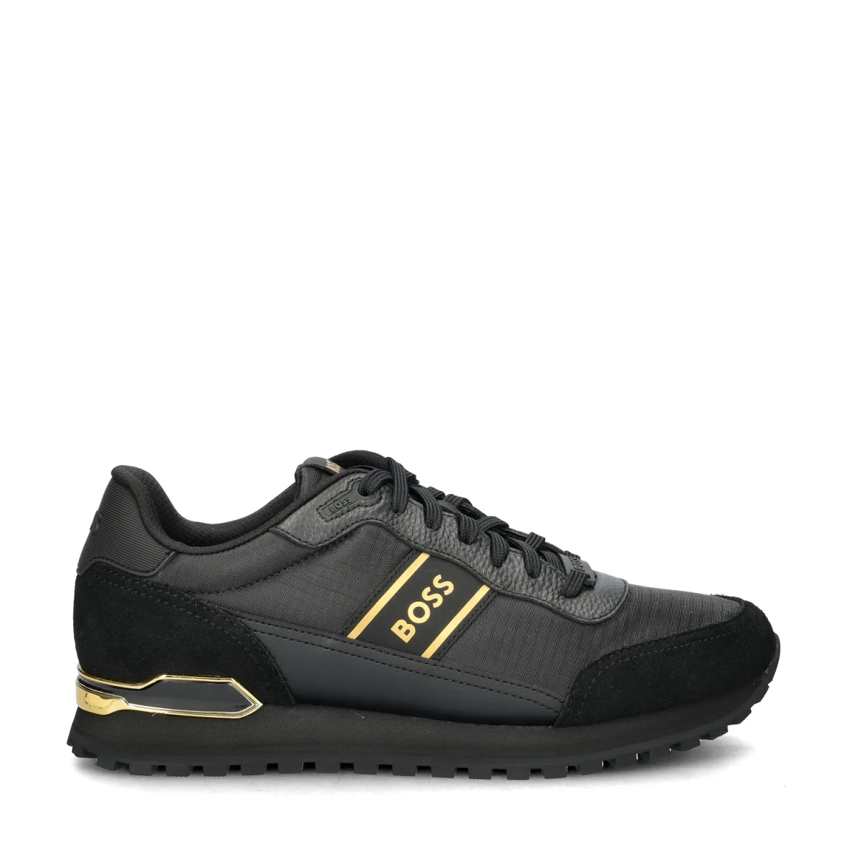 Boss Parkour Runner heren sneaker Comfy sneakers horen in iedere schoenenkast thuis. Deze sneakers uit onze BOSS-collectie zijn de perfecte aanvulling. Uitgevoerd in suède, imitatieleer en nylon met rubberen details om de hiel. De gouden accenten geven de sneakers een luxe look. Gevoerd met textiel en zacht gewatteerd voor een comfortabel draaggevoel. Voorzien van een uitneembaar foam-voetbed voor optimale demping bij iedere stap. Doordat het voetbed uitneembaar is kunnen ook eigen zolen gebruikt worden. Afgewerkt met een schokabsorberende tussenzool en gripvaste rubberen loopzool.