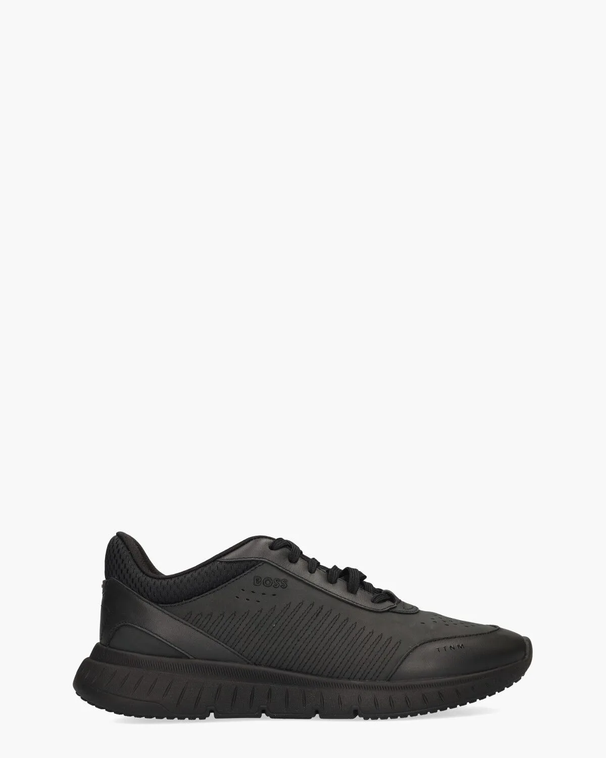 Deze all-black BOSS sneakers voor heren TTNM Light Run combineren nylon meshstof en leer voorzien van zwarte siertsikels voor een modern design. De binnenvoering van stof biedt zacht comfort en bevat een uitneembaar voetbed. De sportieve rubberen zool met robuust profiel is lichtgewicht. Zwarte veters, rubberen versiering op de