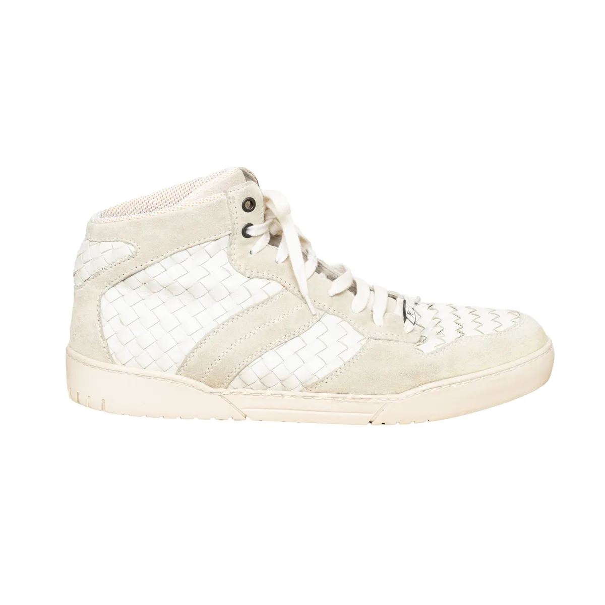 VINTAGE, RRP ALS NIEUW Verhoog je casual stijl met de Bottega Veneta Intrecciato Leren Sneakers. Gemaakt van grijs suede en witte leer, hebben deze hoge sneakers het iconische intrecciato leren ontwerp voor een vleugje merkembleem. Met een veterdetail zijn ze perfect voor elke outfit. Opmerkingen: Er zijn enkele tekenen van slijtage. De maat is niet aangegeven, maar past als een IT 44. Afmetingen: lengte: 746 mm