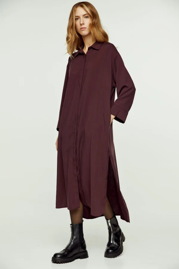 Deze bordeauxrode midi-jurk is gemaakt van geweven tencel. Het heeft een kraag en een blinde sluiting aan de voorzijde met plastic knopen. De mouwen zijn 7/8 lang met manchetten in dezelfde stof en splitjes aan de uiteinden. De jurk heeft hangende schouders. Er is een optionele ceintuur in dezelfde stof. De zoom is afgerond met lange splitten van 40 cm aan de zijkanten.