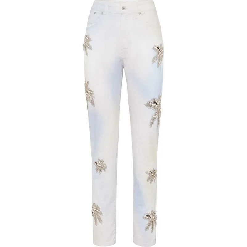 Geborduurde Hawaiiaanse palmbomen met kristallen versieren deze stone washed denim met 5 zakken. Metalen knopen. Het zeshoekige logo van Maison is genaaid op de rechter achterzak. Onderkant, 30 cm, onafgewerkt gesneden. Pasvorm: Vriend.