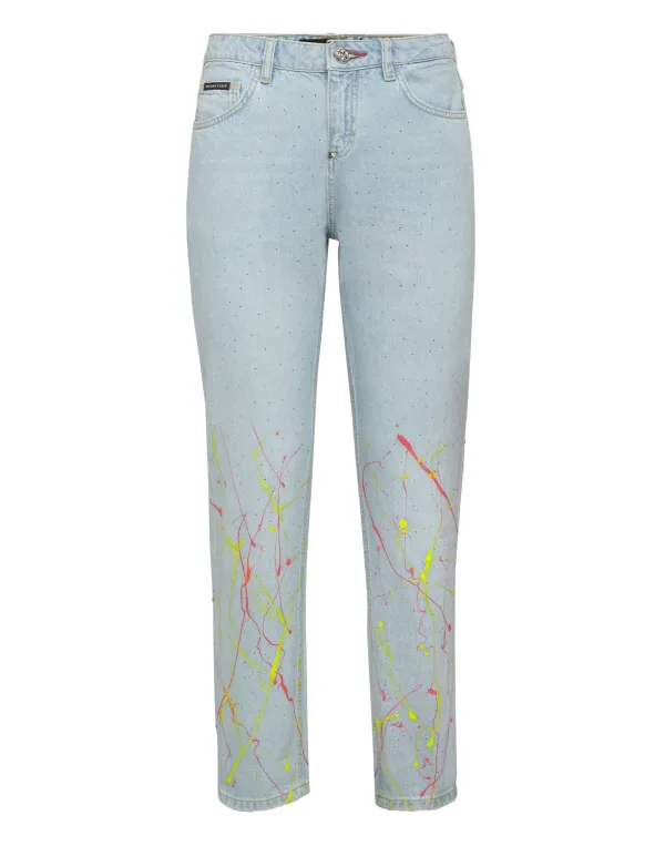 Deze stone washed denim broek met 5 zakken wordt gekenmerkt door gekleurde sprayprints en mini-strass-steentjes die overal zijn aangebracht. Enkele metalen knoopsluiting. Metalen handtekening van Philipp Plein op de achterkant van de tailleband. Onderkant: 30 cm. Pasvorm: Vriend.