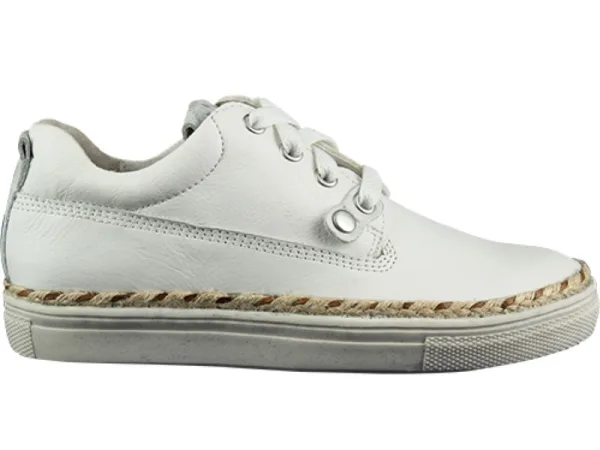 Lage schoen met veters. Materiaal leder van binnen en buiten en touw afwerking rond de rand van de zool. Kleur wit. lekker basic en hip.