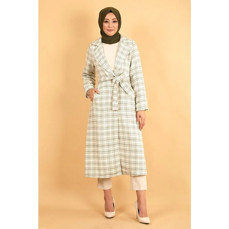 Stofkenmerk: Gemaakt van chanel stof. Productkenmerk: Nieuwe seizoens hijab modeproduct. Het is gevoerd. Het heeft gebruiksvriendelijke knopen aan de voorkant. Er is een pocket. De riem is verwijderbaar. De productkleur kan verschillen door conceptfoto's. Het model draagt maat 38. Maat 38 Kasjmierjas Maten: Productlengte: 114 cm - Borst: 94 cm - Taille: 96 cm - Heupen: 104 cm Lichaamsmaten nemen toe met 3 of 4 cm. (Productlengte verandert niet)