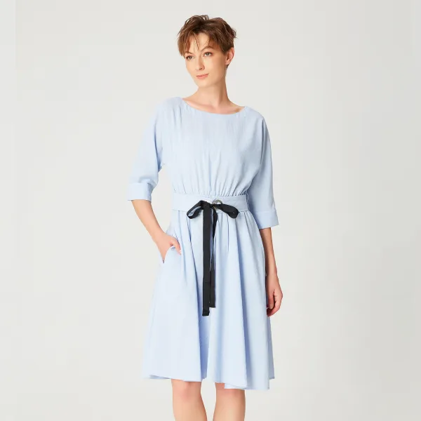 Een minimalistisch en casual stuk in een stof versierd met zeer dunne witte strepen. Een gepaste taille vorm die royaal op de rok oplapt die alle silhouetten benadrukt. Een tijdloze lijn die gemakkelijk met alles te dragen is en matchen. Productdetails • Formulier: fit-and-flare • Lengte: 103 cm • Mouwen: 3/4 • Boothals • Geen bevestiging