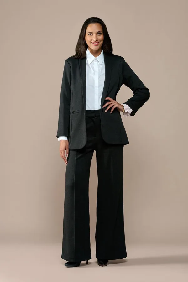 Voeg tijdloze klasse toe aan je garderobe met deze zwarte blazer van Mart Visser. Dit veelzijdige kledingstuk combineert vrouwelijkheid, stijl en draagcomfort in één. De licht getailleerde snit benadrukt subtiel de vormen van je lichaam, terwijl de rechte pasvorm en de lengte tot net over de heup een elegant silhouet creëren. Gemaakt van een lichte, soepel vallende stof met stretch, voelt de blazer aangenaam aan en biedt hij volop bewegingsvrijheid. De diepe zwarte kleur maakt hem krachtig en veelzijdig: ideaal voor formele momenten met de Celia pantalon, maar net zo goed casual te combineren met denim. De klassieke details, zoals de smalle revers, dubbele knoopsluiting met beklede knopen en gepaspelleerde zakken, geven het ontwerp een luxe uitstraling. De deelnaden aan voor- en achterzijde zorgen voor een perfecte pasvorm. Een split aan de achterkant verhoogt het draagcomfort, terwijl de slanke mouwen met stijlvolle naad en klein splitje bij de zoom een subtiel designeraccent toevoegen.