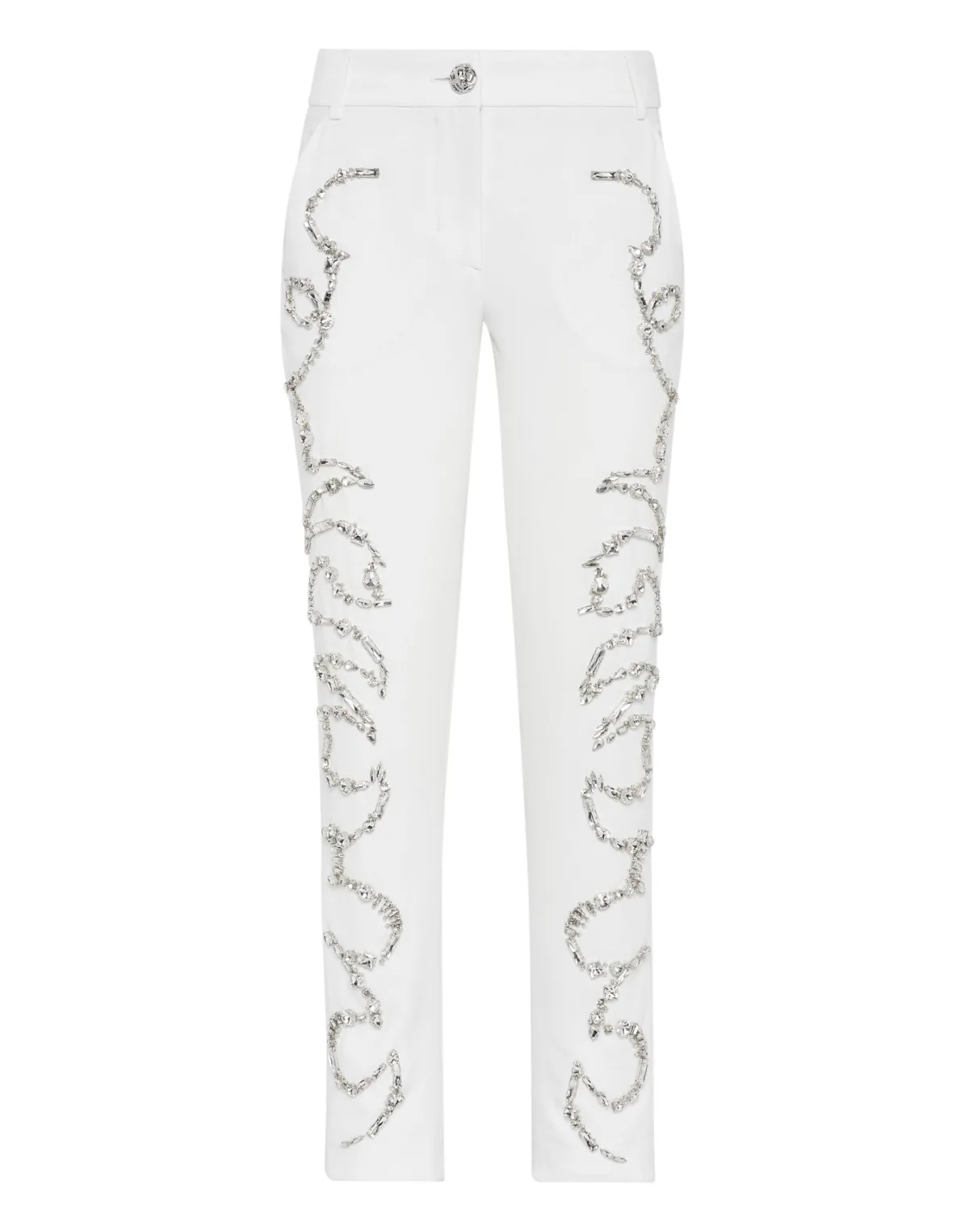 De elegantie van een klassieke broek wordt versterkt door glinsterende details. Bekijk dit model ontworpen voor het nieuwe seizoen. Stretch polyester kady Gemonteerd strass-dessin op beide pijpen Enkele metalen juwelenknoop Steekzakken Figuurlijke pasvorm