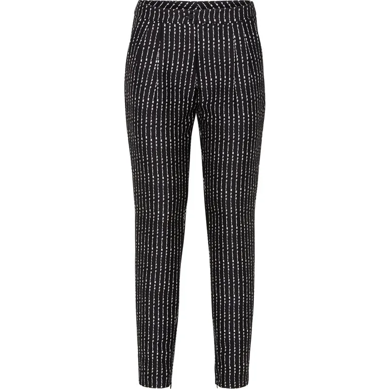 Stretchbroek van viscose en wol verrijkt met krijtstreepeffect van kristallen. Tailleband met één knoop. Twee zakken aan de voorkant.