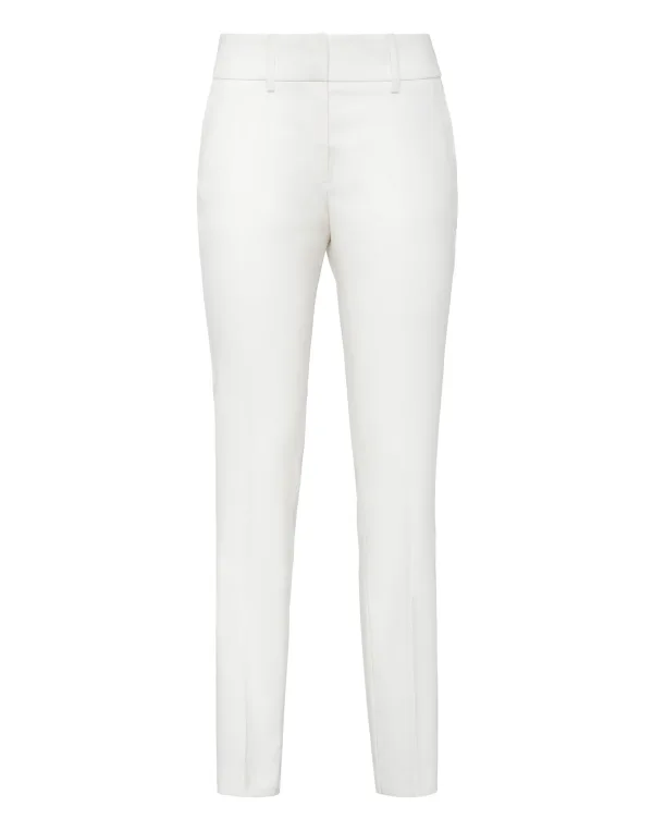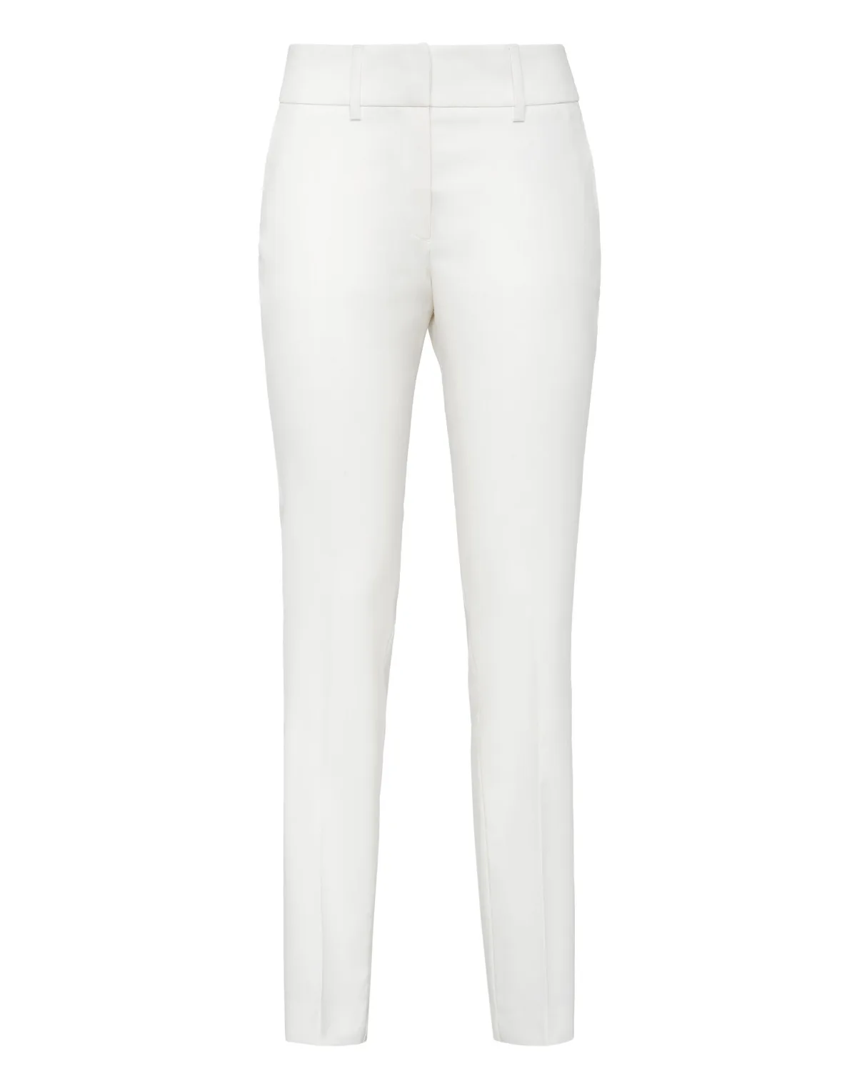 Deze getailleerde stretchbroek van wolmix accentueert je figuur. Twee steekzakken op de achterkant. Onderkant met zijsplitten. Enkele metalen knoopsluiting.
