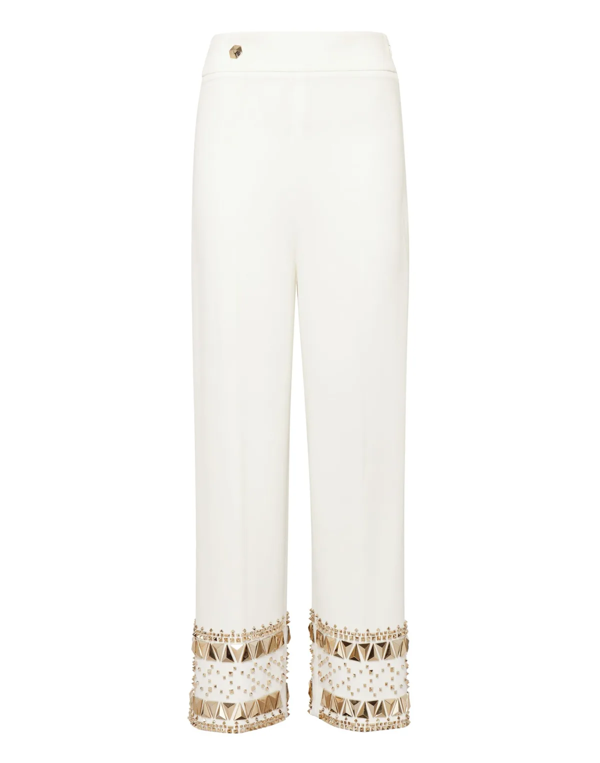 Met studs Iets klassieks, maar niet te veel? Deze viscose Capri broek met studs is het antwoord. De hoge taille en de verborgen ritssluiting aan de linkerkant zijn slechts enkele van de stijlvolle details.