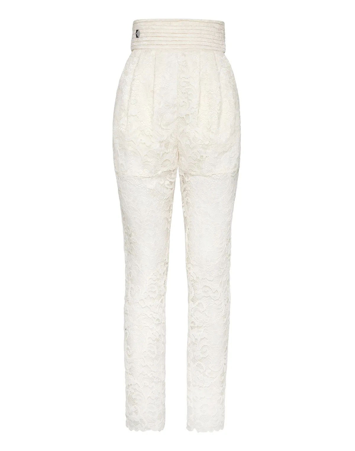 Losse broek van kant. Verschillende plooien zorgen voor zachte drapering. Geplooide tailleband. Halfgevoerd. Onzichtbare ritssluiting middenachter.
