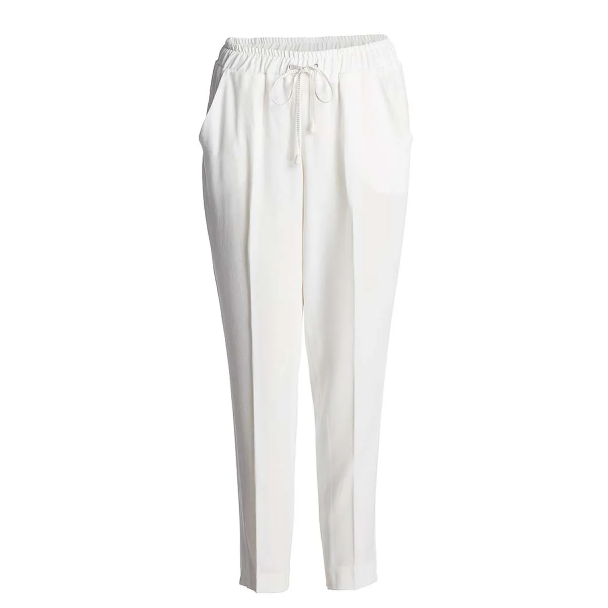 Broek CONQUISTA in effen crêpe polyester stof. Elastische tailleband in dezelfde stof met een breedte van 4 cm. Striksluiting vooraan. Zakken opzij. Taps toelopende pijp. Lengte, voor maat 36/S, 99cm inclusief tailleband. 92% polyester-8% elastan.
