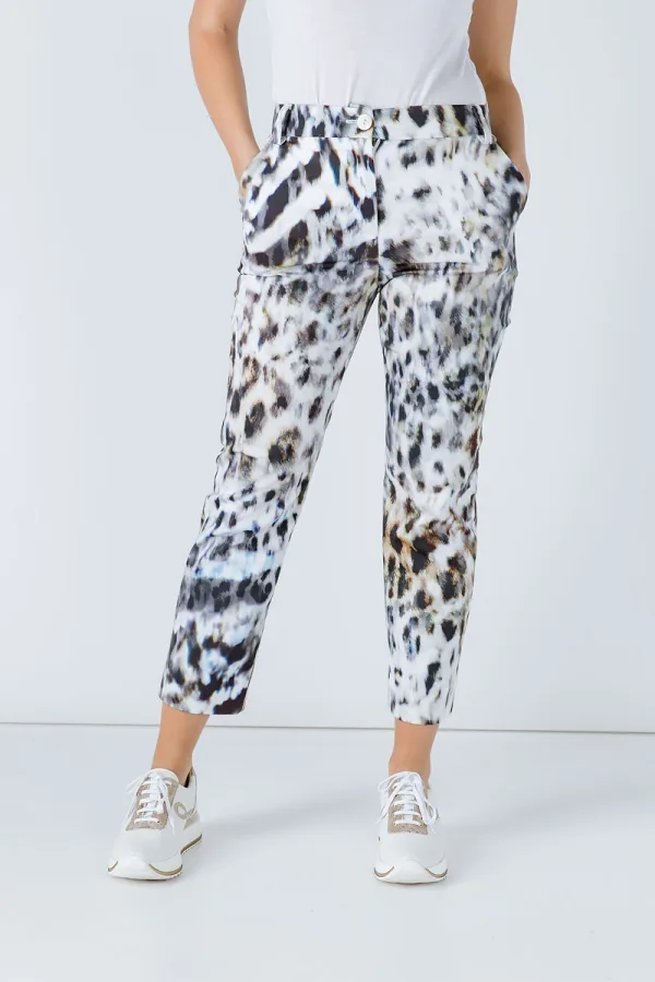 Deze enkellange broek is gemaakt van geweven gabardine met dierenprint. Er zijn twee binnenzakken voor en twee nepzakken achter. Er is een tailleband met riemlussen. De broek sluit aan de voorkant met een ecru plastic knoop en een verborgen ritssluiting.
