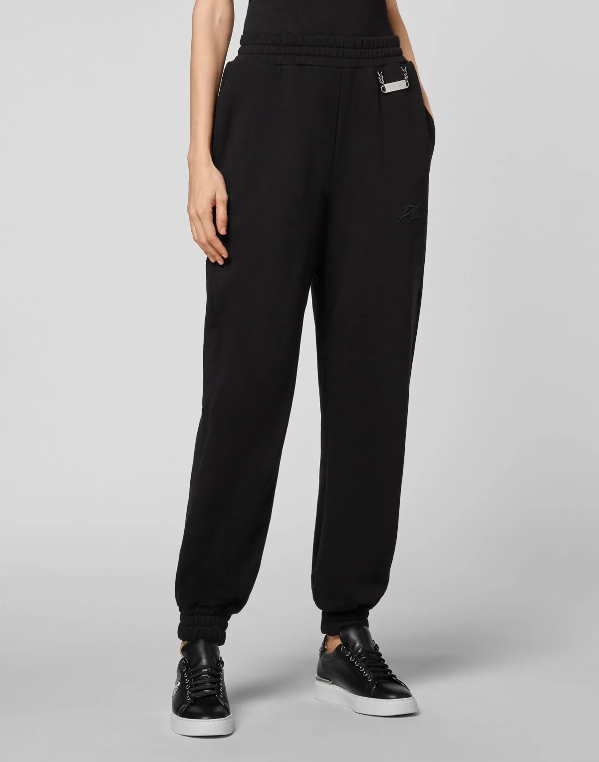 Katoenen fleece joggers met de geborduurde Plein Signature op de linkerpijp. Dog tag genaaid aan tailleband. Twee paspelzakken. Elastische tailleband en manchetten onderaan.
