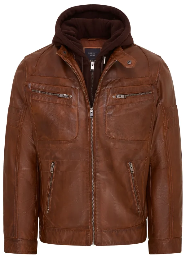 Bruin leren bikerjack met capuchon voor heren – Stavern
