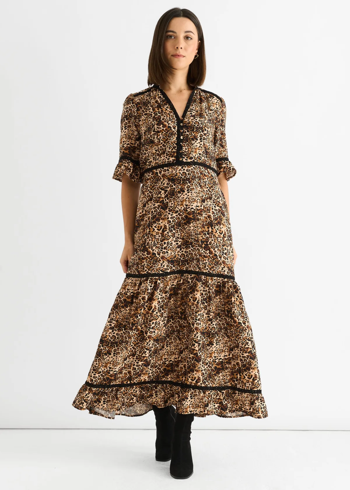 Deze bruine dierenprint midi-jurk met kanten rand in lagen combineert casual comfort met gedurfde stijl. Met een vloeiende, gelaagde silhouet en delicate kanten afwerking, biedt het eenvoudige beweging en een vrouwelijke touch. De opvallende dierenprint voegt zelfvertrouwen toe aan je dagelijkse look, waardoor het perfect is voor ontspannen, maar opvallende gelegenheden.