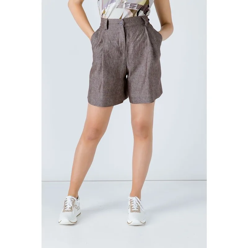 Bruine korte short van geweven linnenstof. 2 binnenzakken aan de voorkant, 1 nepzak aan de achterkant. Tailleband met riemlussen met daaronder 2 plooien vooraan. Verborgen ritssluiting met 1 bruine kunststof knoop aan de voorzijde. Ons model is 172 cm lang en draagt maat 36/S. Afmetingen bij maat 36 (in cm): Taille-34; Bodem-49; Lichaamslengte-46/15. 100%LINO