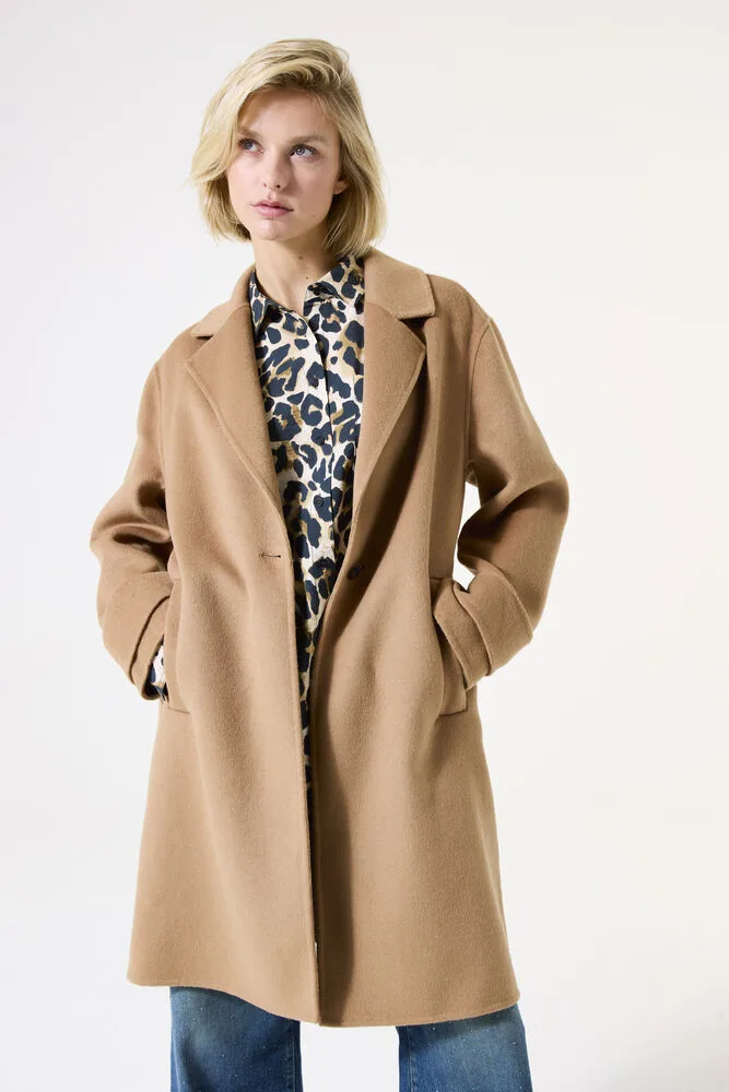 Stijlvolle lange mantel van een wolblend. Deze jas heeft een lengte tot boven de knie, lange mouwen met epauletdetails op de manchetten, een oversized kraag, steekzakken, een knoopsluiting en een relaxed fit. Perfect voor een elegante én moeiteloos moderne look. De buitenlaag van deze jas is gemaakt van 60% polyester en 40% wol.