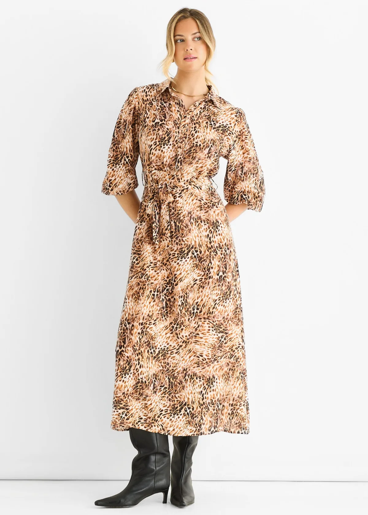 Deze bruine midi-jurk met dierenprint combineert een gedurfde stijl met casual comfort. Met een opvallende dierenprint en een relaxed shirtmodel biedt deze jurk een comfortabele pasvorm die perfect is voor dagelijks gebruik.