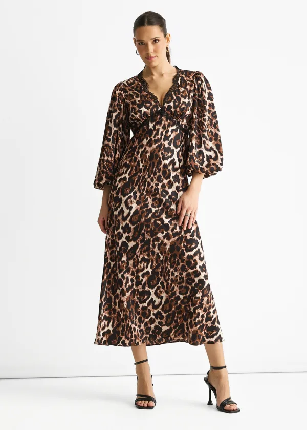 Bruine midi-jurk van satijn met kantrand en dierenprint
