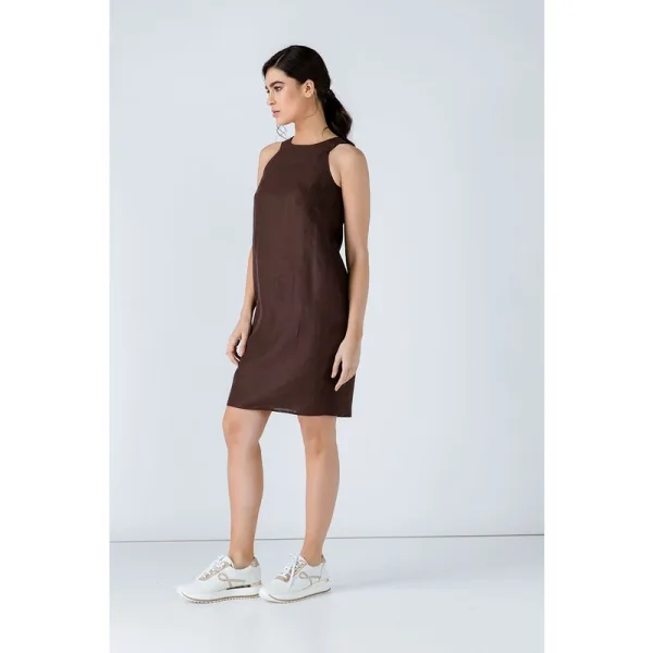 Zomerse zakjurk van bruin geweven linnen. Ronde hals en mouwloos. Plooien op de borst en 2 steekzakken. Verborgen ritssluiting op de rug, toon op toon. Ons model is 172 cm en draagt maat 36/S. Afmetingen voor maat 36 (in cm): Schouder -28; Borst-45; Taille-50; Onderkant-52; Lichaamslengte-95. Losse pasvorm. 100% linnen