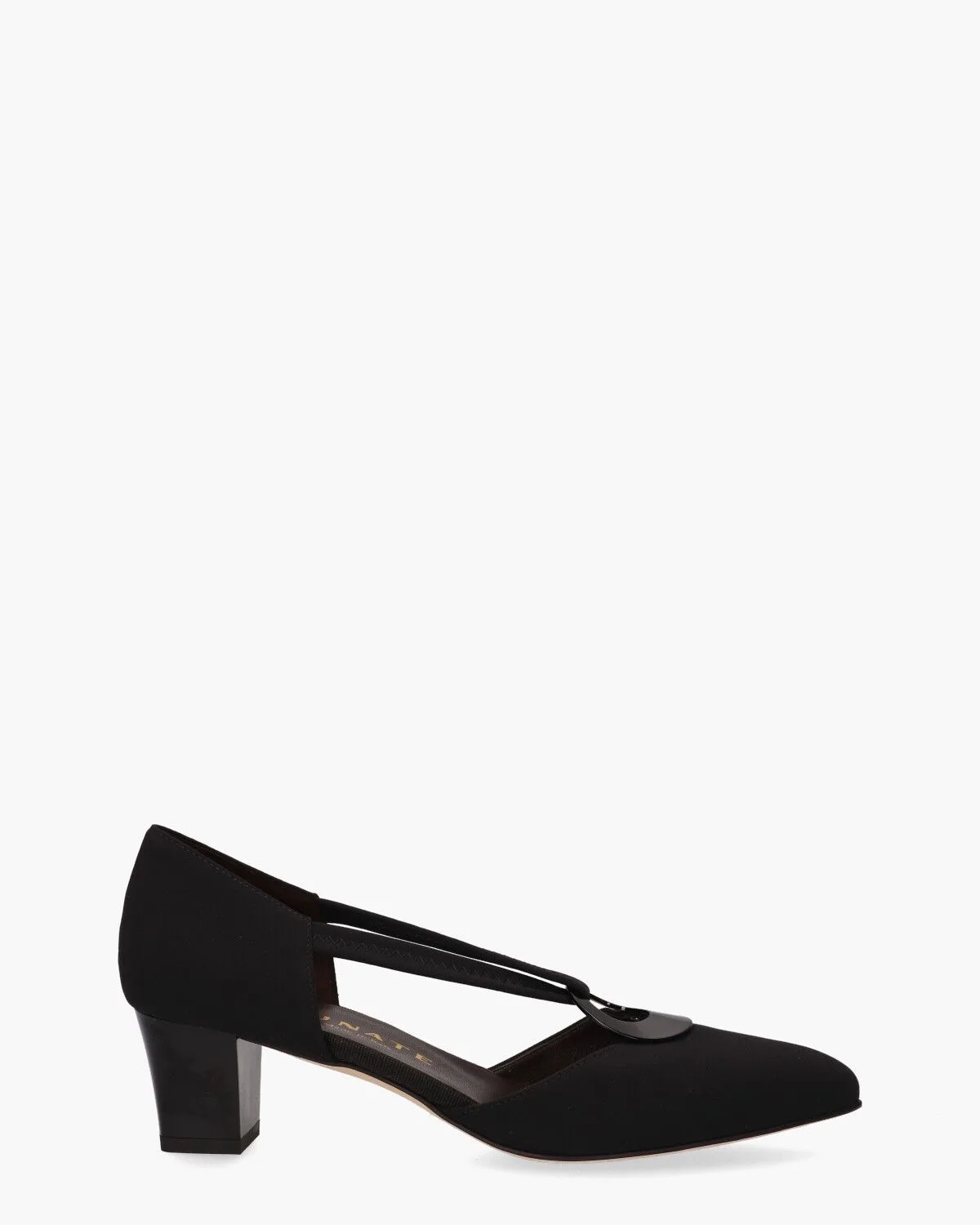 Opengewerkte pumps voor dames van het merk Brunate. Deze zwarte damesschoen 50688 heeft een upper van zachte veloursstof. De binnenkant is in leer uitgevoerd en voorzien van een vast voetbed. Bijzonder is de ringapplicatie met stretchbandjes op de wreef. De glanzende hak heeft een hoogte van ongeveer 5 cm. De leest is spits toelopend. Kleur: zwart. (Nero)