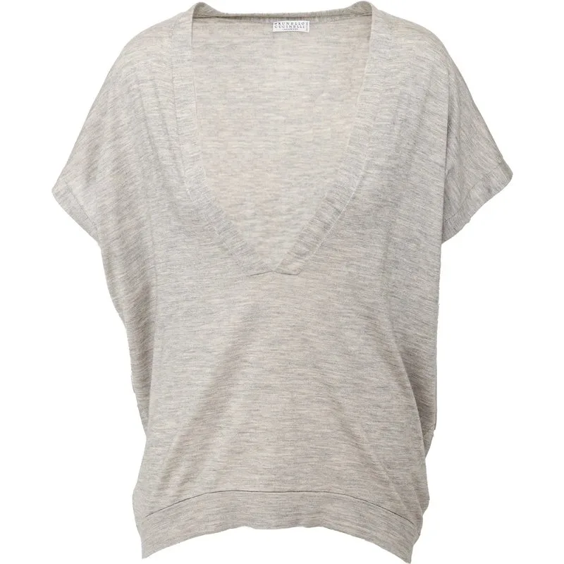 VINTAGE, RRP ALS NIEUW Brunello Cucinelli lichtgrijze top van een luxe kasjmier-zijde mix. Heeft een diepe V-hals, een ontspannen pasvorm en een subtiel kortere voorkant voor een casual silhouet. Afmetingen: schouderbandlengte: 0 mm hengeldrop: 0 mm