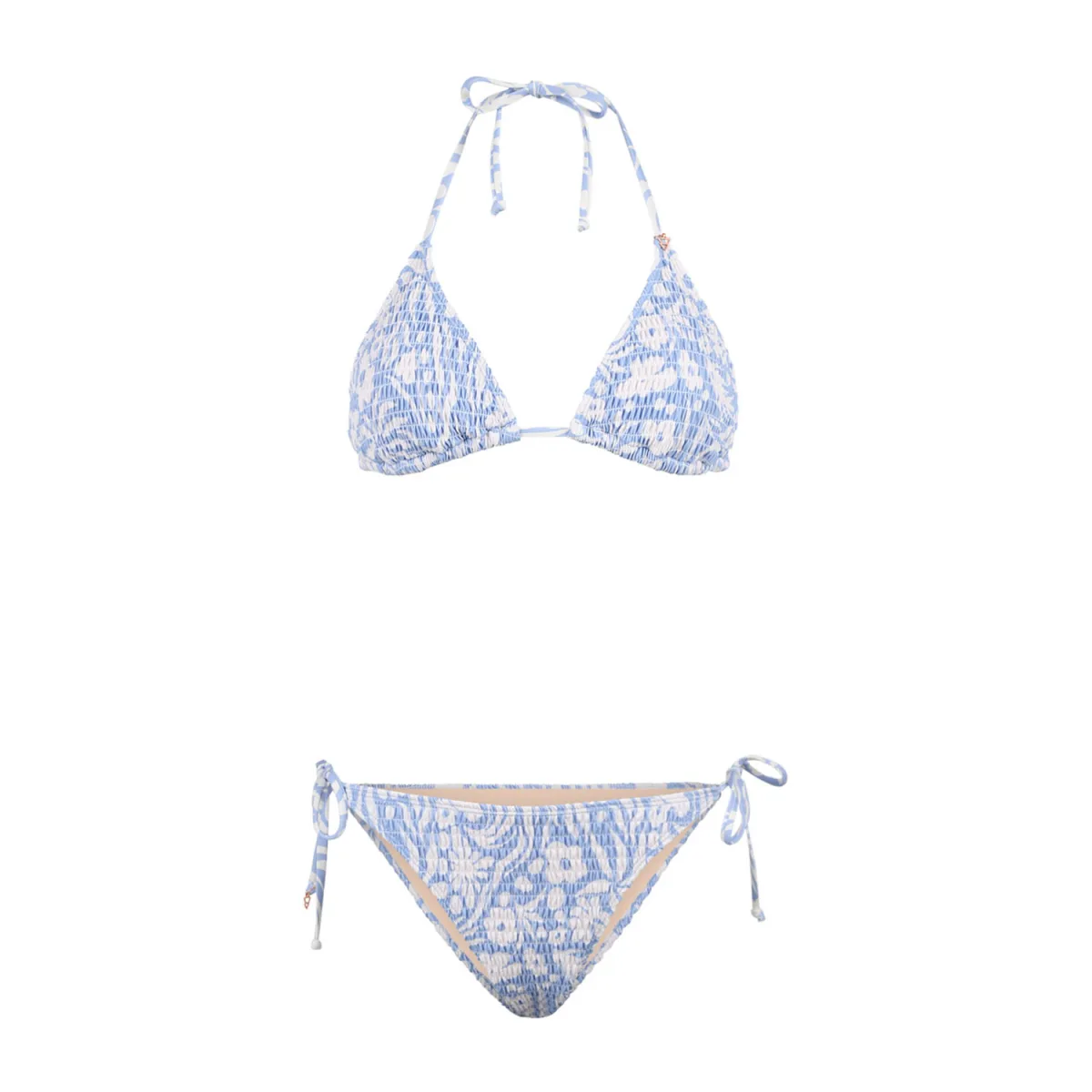 De Mahlia-Swirl Bikiniset combineert stijl en comfort met een verfijnd gesmockt stofdesign en een prachtige print in violet en zacht wit. De unieke swirl-patroon geeft een dynamische en vrouwelijke uitstraling, terwijl de textuur zorgt voor een flatterende look. Dankzij de verstelbare bandjes en de comfortabele pasvorm biedt deze bikini een perfecte, op maat gemaakte fit. Ideaal voor wie houdt van een combinatie van elegantie en gemak, of je nu ontspant aan het zwembad of geniet van een dag op het strand.