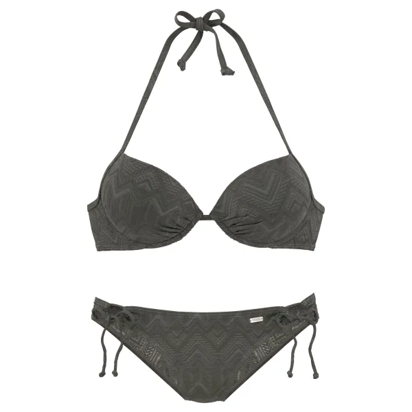 Cup soorten: Full cup bh; Soort bandjes: Halterbandjes; Bh/bikini type: Push-up; Beugel: Met beugel; Broekvorm: Zijdelings gebonden; Details: Gedrapeerd; Extra's: Label plaatje, All-over patroon, Op staal naden