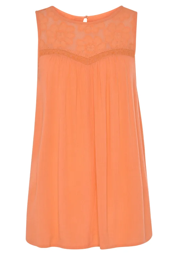 Blouse type: Blouseshirt; Design: Keyholesluiting; Type sluiting: Knoopsluiting; Materiaal: Crêpe; Halstype: Ronde hals; Motief: Effen; Kraag: Zonder kraag; Soort bandjes: Brede bandjes; Details: Cut-outs, Kant, Gedrapeerd; Extra's: Licht transparant; Pasvorm: Normale pasvorm; Armlengte: Mouwloos; Lengte: Normale lengte
