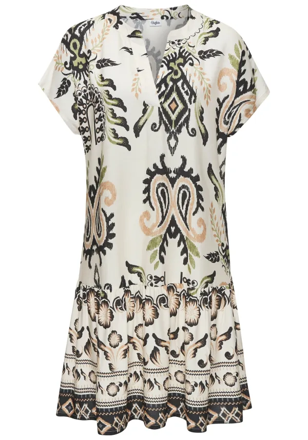 Design: Gevoerde zoom/rand; Materiaal: Viscose; Halstype: Uitgesneden hals; Motief: Paisley; Kraag: Tuniek kraag; Details: Volant, Gedrapeerd; Extra's: All-over patroon; Lengte: Kort/mini; Snit: Uitlopend; Pasvorm: Losse pasvorm; Armlengte: Kwartmouw