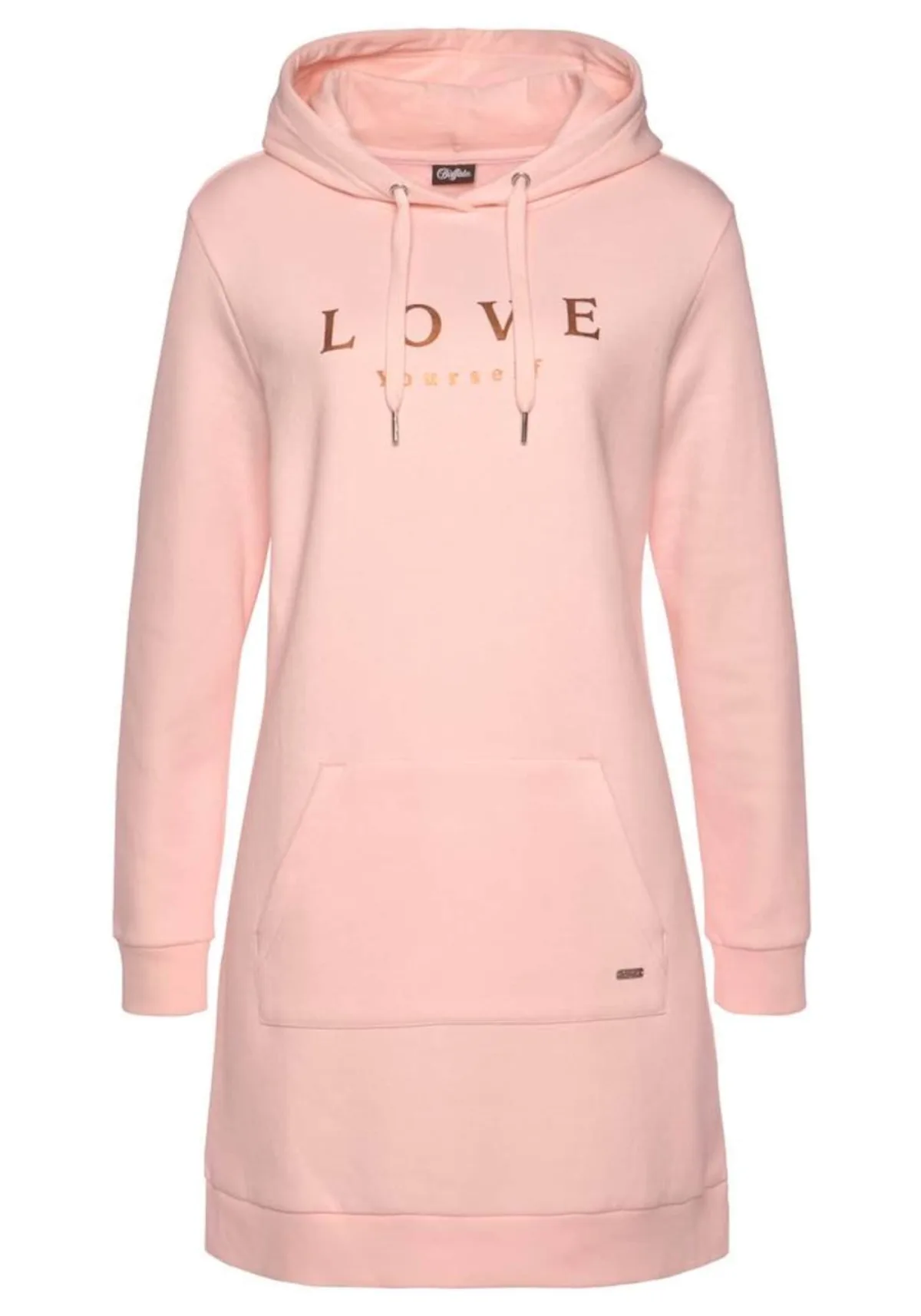 Design: Geribd ceintuurtje; Halstype: Capuchon; Motief: Tekst print; Extra's: Voelt zacht aan; Lengte: Kort/mini; Pasvorm: Normale pasvorm; Armlengte: Lange mouw