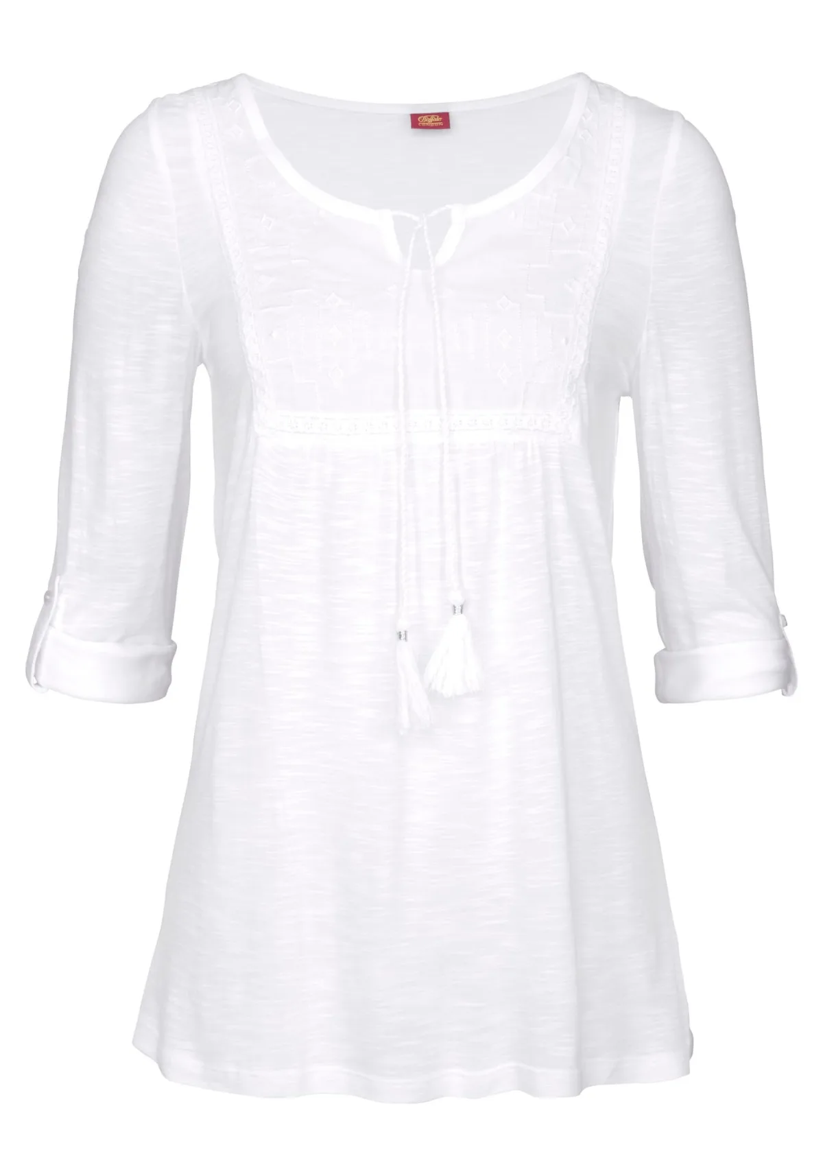 Design: Gevoerde zoom/rand, Mouw revers, Flare, Om te knopen/binden; Materiaal: Viscose; Halstype: Uitgesneden hals; Motief: Effen; Details: Borduursels; Extra's: Applicaties, Op staal naden, Voelt zacht aan; Pasvorm: Normale pasvorm; Armlengte: Driekwart mouw; Lengte: Normale lengte