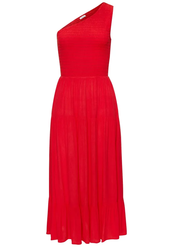 Design: Gevoerde zoom/rand, Flare; Materiaal: Viscose; Motief: Effen; Soort bandjes: One-shoulder; Details: Volant, Gedrapeerd; Extra's: Met textuur; Lengte: 7/8 lengte; Snit: Getailleerd; Pasvorm: Slanke pasvorm; Armlengte: Mouwloos