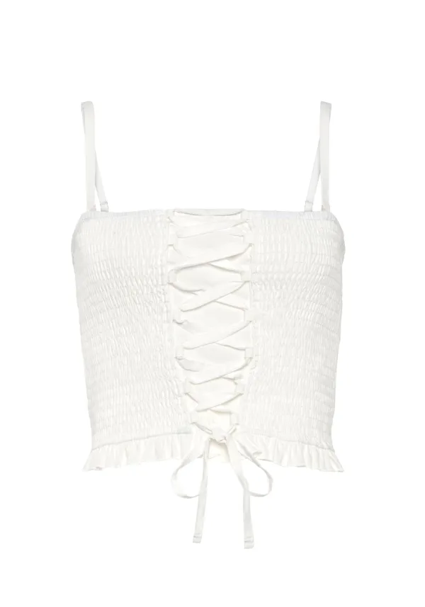Blouse type: Blouseshirt; Design: Om te knopen/binden; Materiaal: Katoen; Halstype: Carréhals; Motief: Effen; Kraag: Zonder kraag; Soort bandjes: Spaghettibandjes; Details: Volant; Extra's: All-over patroon, Fully fashioned; Pasvorm: Aansluitende pasvorm; Armlengte: Mouwloos; Lengte: Korte pasvorm