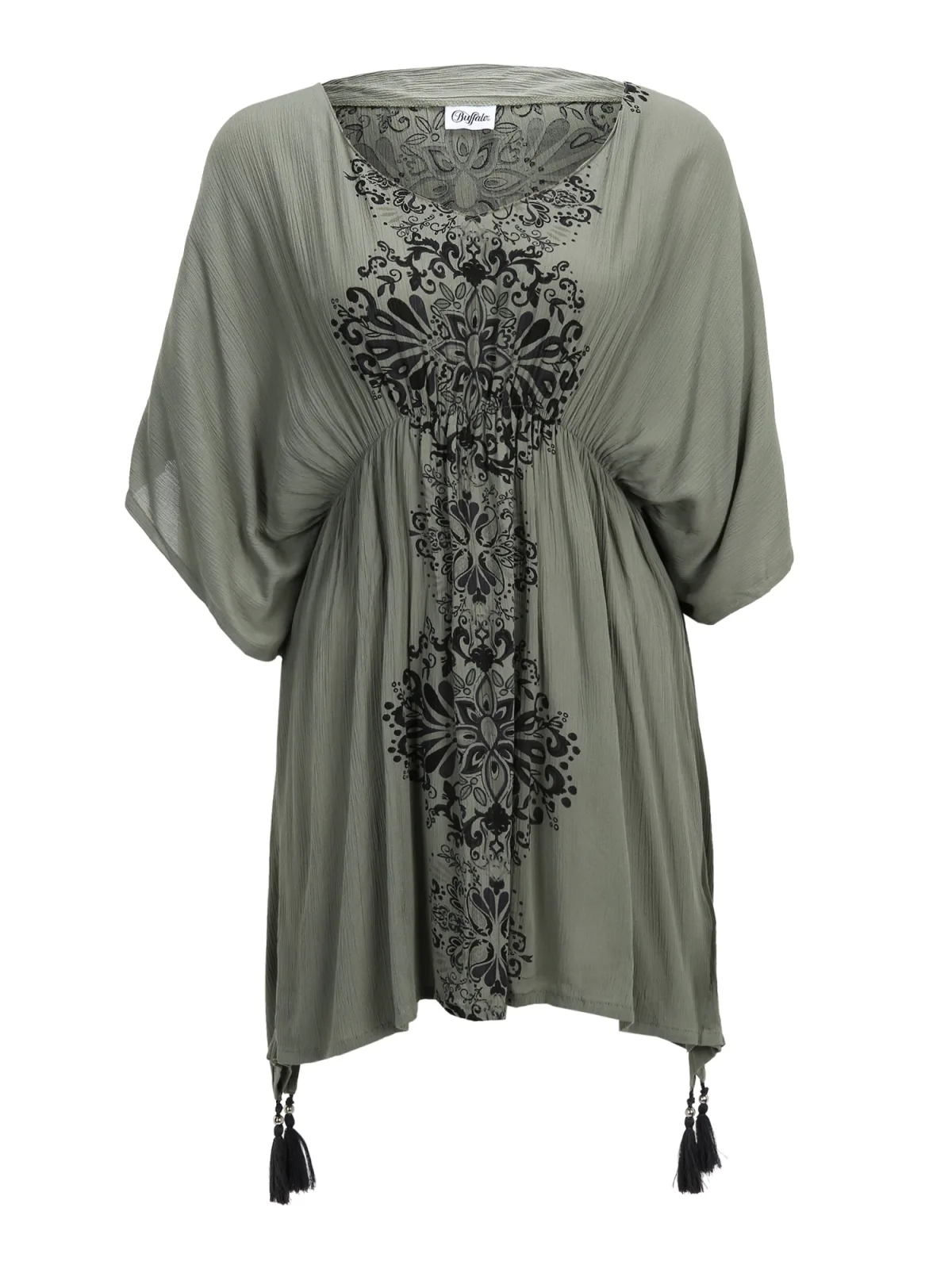 Materiaal: Viscose; Motief: Bloemenprint; Kraag: Zonder kraag; Details: Franjes, Gedrapeerd; Pasvorm: Normale pasvorm; Armlengte: Halve mouw; Lengte: Normale lengte