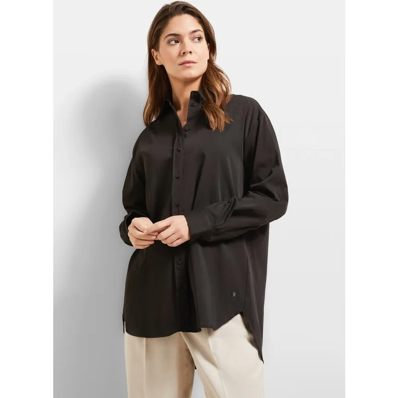 Lange overhemdblouse van stretchkatoenen stof (Flexity), de langere vorm is ideaal voor laagjeslooks. De blouse heeft een boxplooi aan de achterkant en een afgeronde zoom.