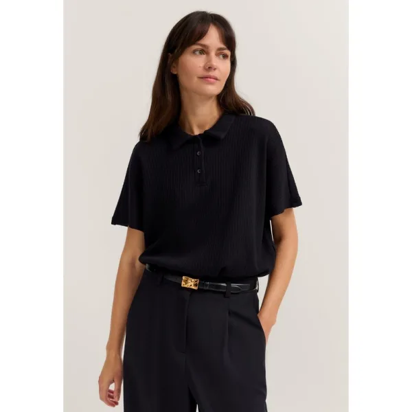 Met het bugatti damespoloshirt in moderne pasvorm kies je voor een tijdloze stijl en hoog draagcomfort. De mix van 50% katoen en 50% polyester met gestructureerde look voelt aangenaam aan op de huid en blijft tegelijkertijd vormvast. De klassieke overhemdkraag geeft het shirt een elegante uitstraling, de halflange mouwen maken het ideaal voor warme dagen. Perfect te combineren met jeans, shorts of een rok - of je nu op kantoor bent of in je vrije tijd, dit poloshirt is een veelzijdige metgezel voor je dagelijkse leven.