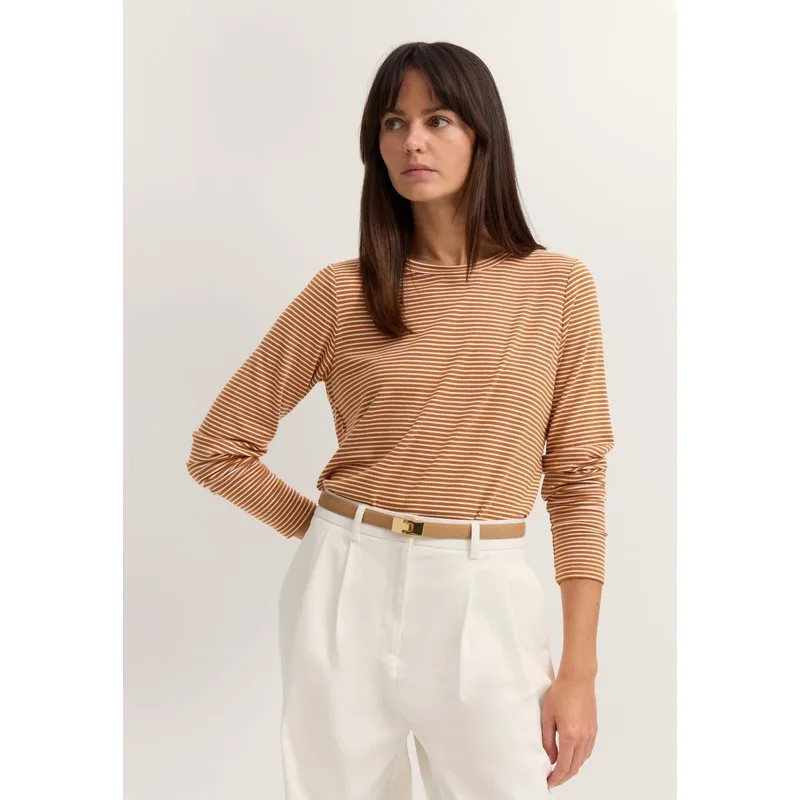 Dit bugatti dames shirt met lange mouwen in Modern Fit is gemaakt van 93% modal en 7% elastaan en voelt daardoor bijzonder zacht en elastisch aan. Het gestreepte ontwerp geeft het shirt een moderne look, terwijl de wijde ronde hals tijdloze elegantie uitstraalt. De lange mouwen maken het een veelzijdige metgezel voor vrije tijd en kantoor.