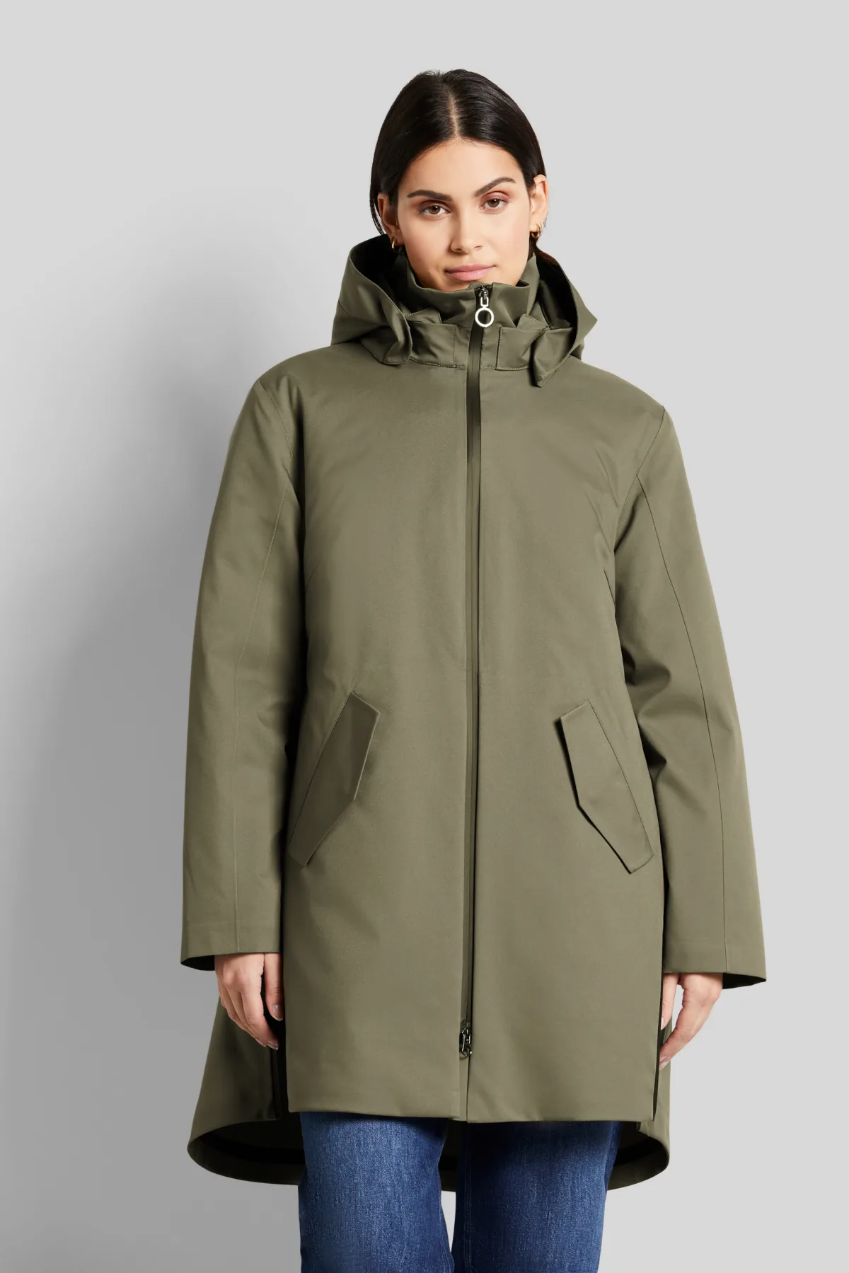 Een sportieve regenparka met functie in een waterafstotende en winddichte maar ademende gecoate stof met extra waterdichte ritsen. De jas heeft ook een opstaande kraag en afneembare capuchon. Het knusse breisel aan de binnenkant voorkomt tocht. De gewatteerde binnenvoering kan worden verwijderd en heeft extra, functionele steekzakken als de zijsplitten open zijn.