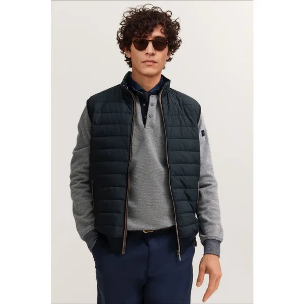 Dit bugatti gewatteerde vest voor heren staat voor een moderne stijl en aangenaam draagcomfort. De slimme materiaalmix maakt het verschil: de gewatteerde voorkant van polyester zorgt voor een eigentijdse look, terwijl de achterkant van katoen aangenaam zacht aanvoelt op de huid. Het vest heeft een regular fit en biedt je bewegingsvrijheid en een ontspannen silhouet. De opstaande kraag en de ritssluiting onderstrepen de strakke, moderne look. Of je het nu in het dagelijks leven, op reis of tijdens ontspannen momenten in de geest van la dolce vita draagt - dit mouwloze vest is veelzijdig te combineren.